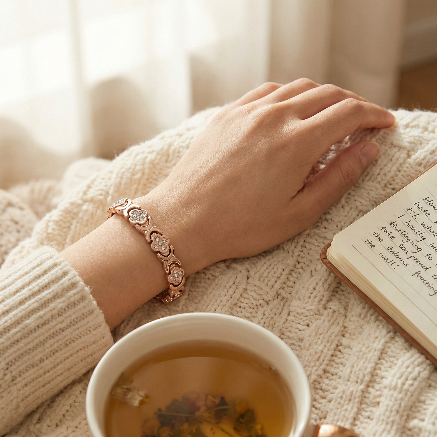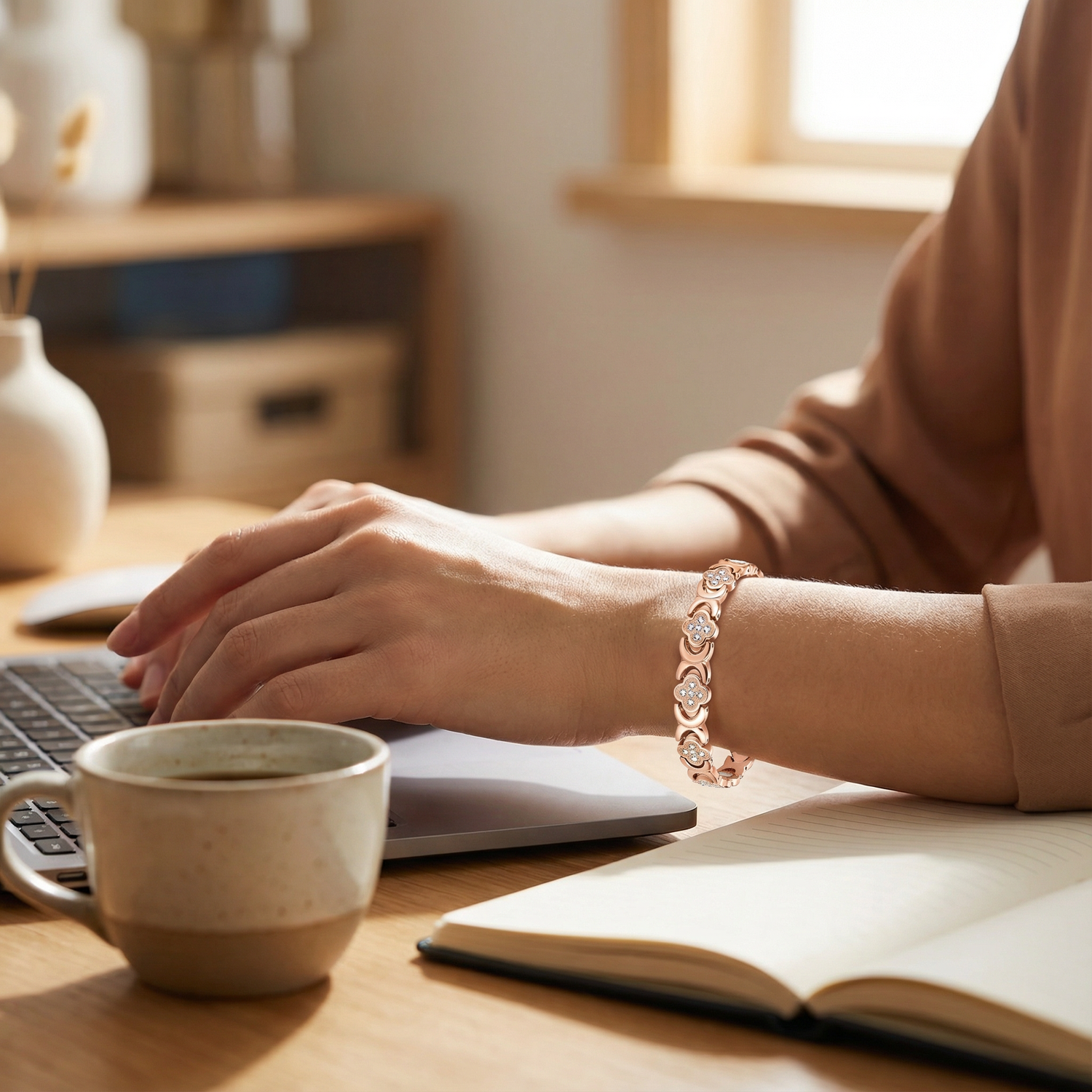 The Essence Copper Bracelet— Magnetic Wellness Design combines genuine copper with discreet magnetic elements for a calming, all-day experience. It's lightweight, effortless, and elegant—takes seconds to put on and goes with you to the office, your commute, and evening wind-down. No technology. No instructions. Just a natural routine.